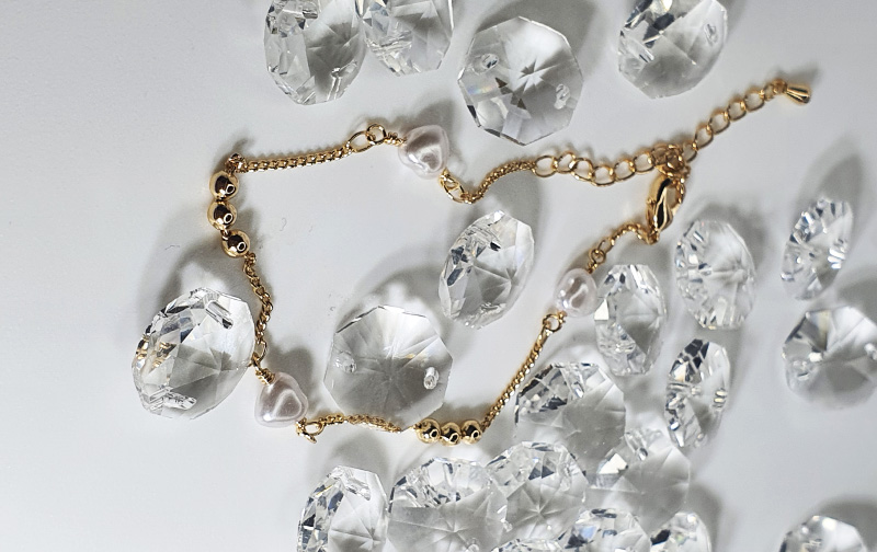 Pulsera bañada en oro 21kts con engaste de pequeños cristales de colores suaves facetados