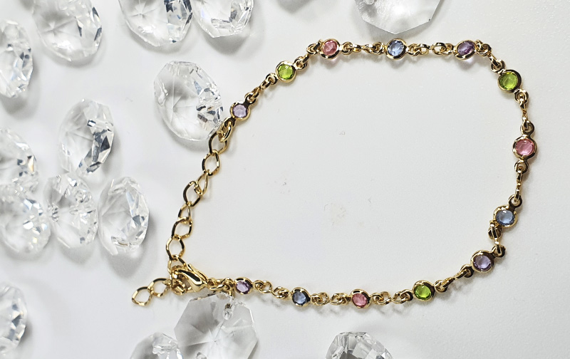 Pulsera bañada en oro 21kts con engaste de pequeños cristales de colores suaves facetados